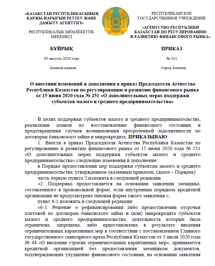 О внесении изменений и дополнения в приказ Председателя Агентства Республики Казахстан по регулированию и развитию финансового рынка от 15 июня 2020 года № 251 «О дополнительных мерах поддержки субъектов малого и среднего предпринимательства