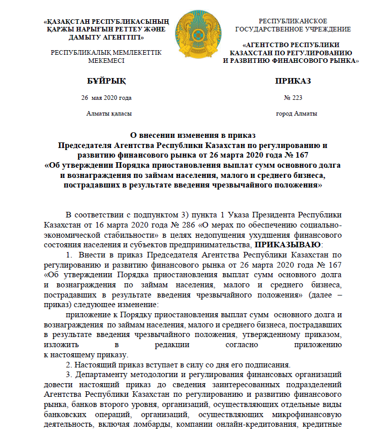 Об утверждении Порядка приостановления выплат сумм основного долга и вознаграждения по займам населения, малого и среднего бизнеса, пострадавших в результате введения чрезвычайного положения