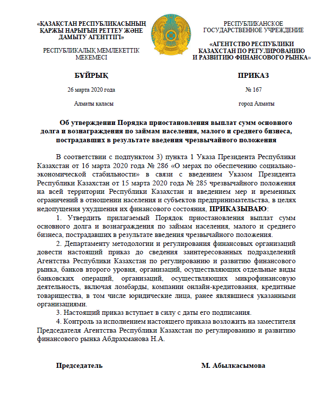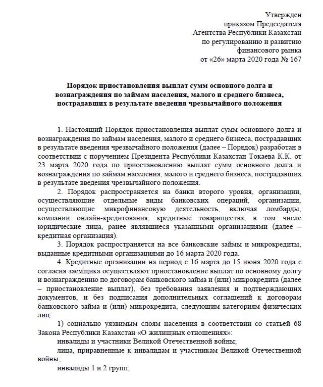 Об утверждении Порядка приостановления выплат сумм основного долга и вознаграждения по займам населения, малого и среднего бизнеса, пострадавших в результате введения чрезвычайного положения